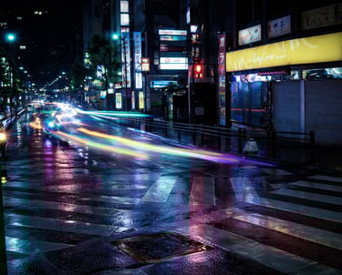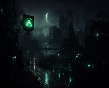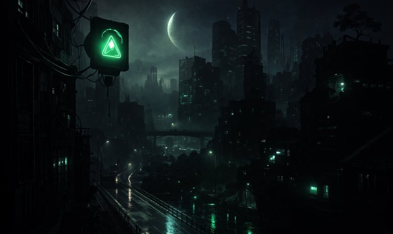 Cinematic concept design capturing quiet moments in a futuristic cityscape, blending shadow and neon green highlights to evoke mystery and depth.